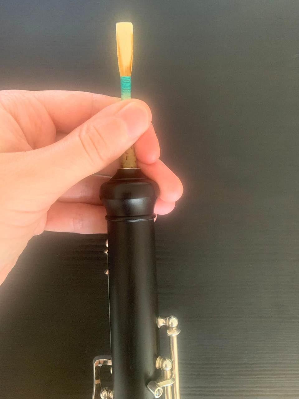 Finally, add your reed to the top of the top joint! I also like to keep the bell of the oboe resting on my leg while I add the reed. Make sure that the reed is pushed in all the way. You should feel a bump once the reed is fully pushed in, and there should be about 1.5cm of cork exposed. It will look like this: