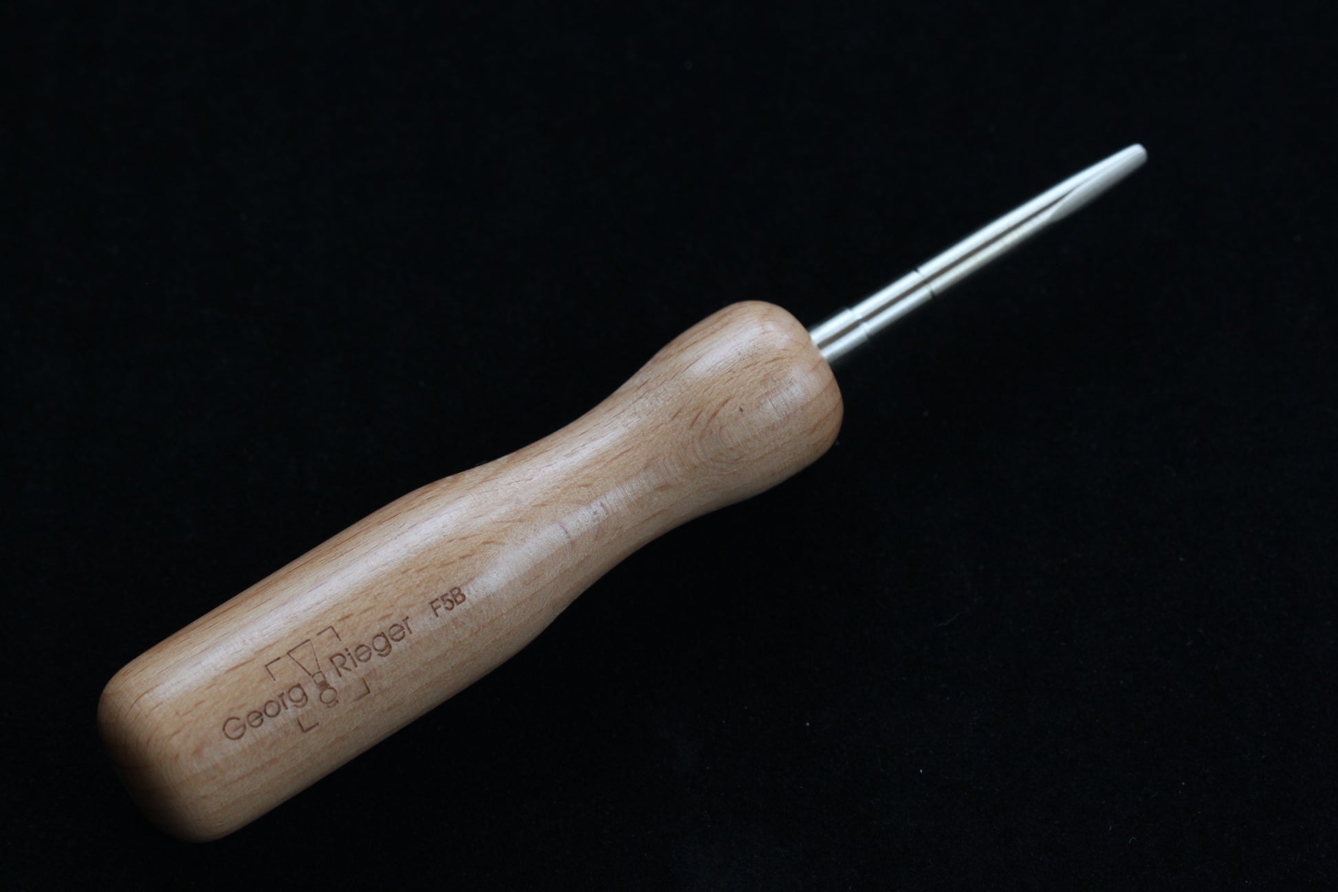 Rieger's F5B forming mandrel has a flattened tip that helps minimize the likeliness of cracking when first inserting the mandrel. Markings along mandrel indicate the correct placement stop at, improving accuracy and consistency in the forming process. The ergonomic handle is great for reed makers who form in large batches.