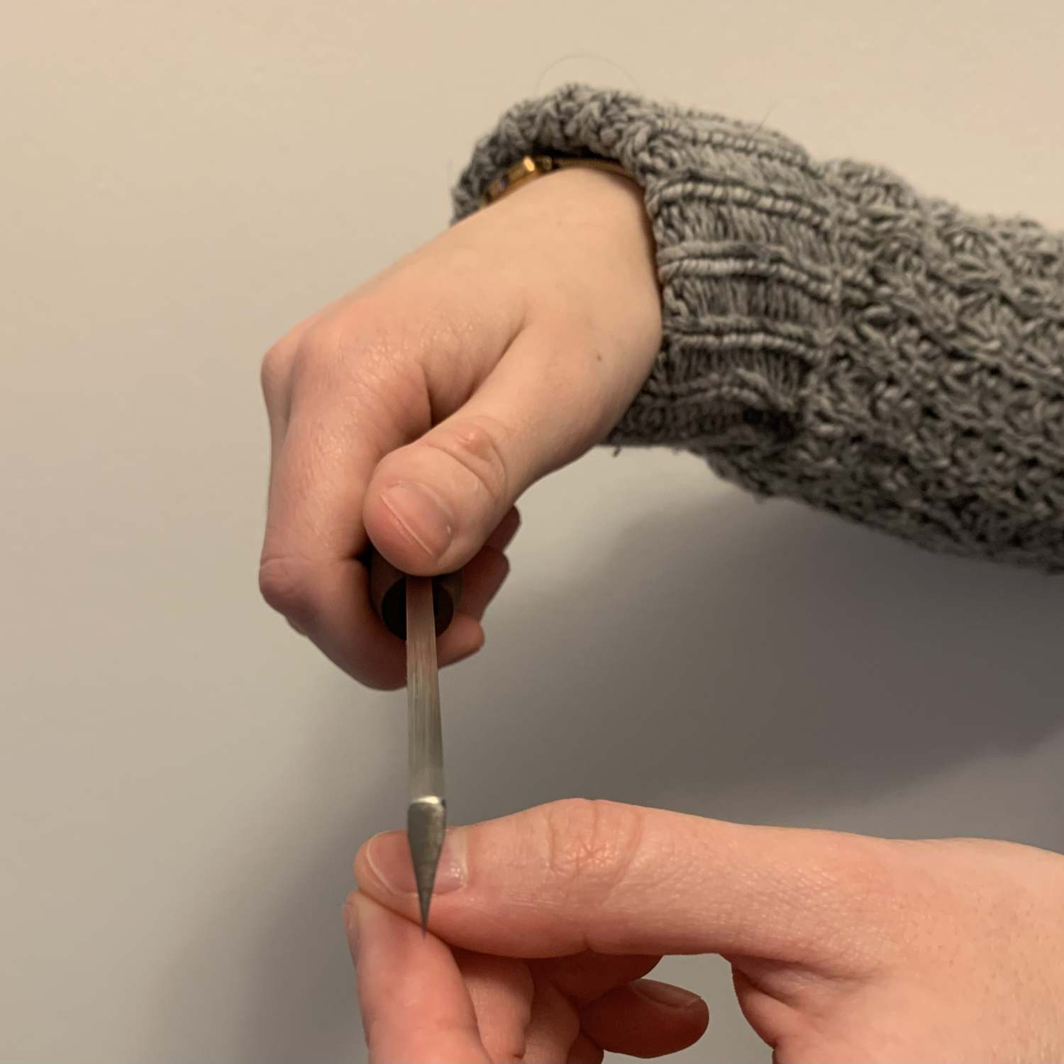 To check if your knife is sharp, hold it in your dominant hand with the blade upright, while gently resting the weight of the knife blade on the thumbnail of your non-dominant hand. It will look like this (for a right-handed reedmaker):