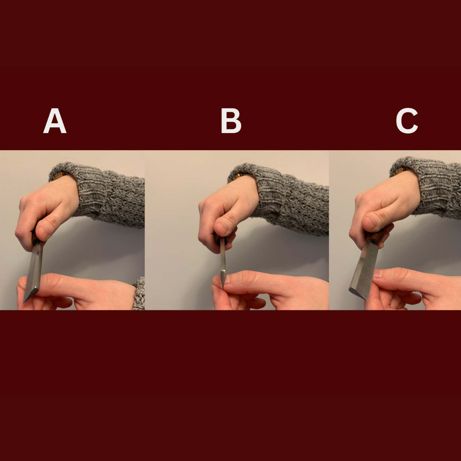 If the knife only catches on your nail while angled away from you (picture C), then your burr angle is too steep. If you’ve ever heard anyone talking about a reed knife being ‘too sharp’, this is what they mean. While it is technically possible to scrape a reed with a steeply angled burr, I wouldn’t recommend it, as it will create nicks/catches in the cane and will probably chip the tip.