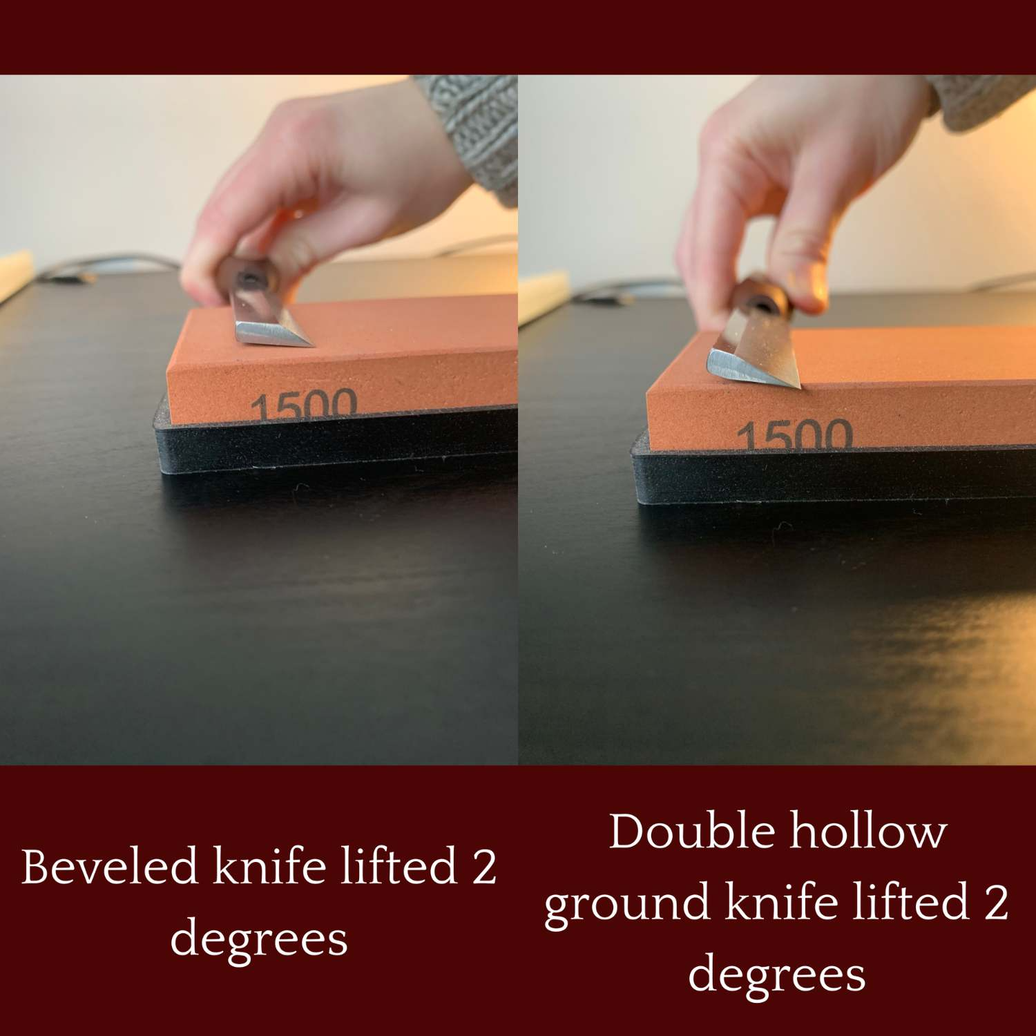 Once you determine the angle of the far side, repeat the process for the close side of your knife, gradually increasing the angle until you hear and feel the knife grinding on the stone. Note that this may be a different angle than the far side angle, even on the same knife!