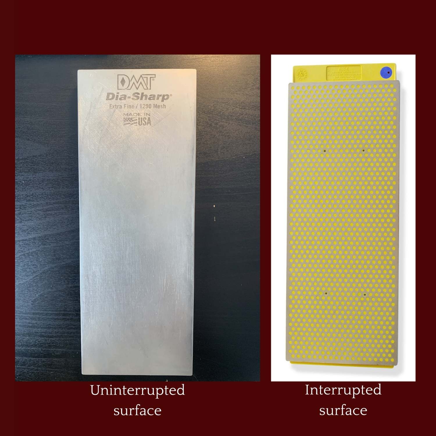 The uninterrupted stones tend to feel more smooth and fine, and the interrupted surface stones are more coarse and better suited for regrinding an old knife. Both types have a longer break-in period, especially the interrupted surface style.