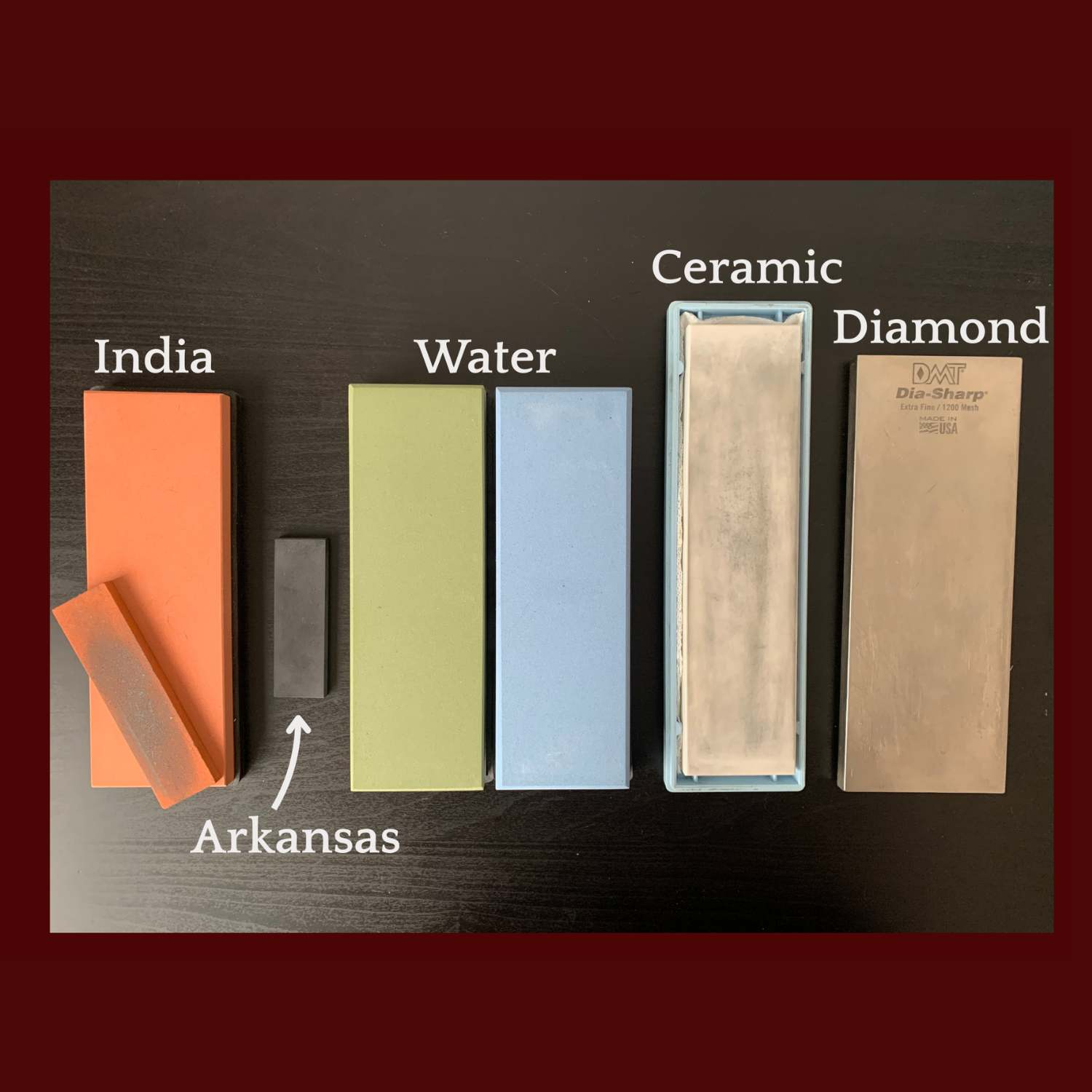 India stones are probably the most common beginner sharpening stone type. Generally found in medium-fine grit, they are abrasive enough to regrind an edge but smooth enough to hone a burr nicely, especially once they are broken in. You will find that the longer you use an India stone, the smoother it feels.